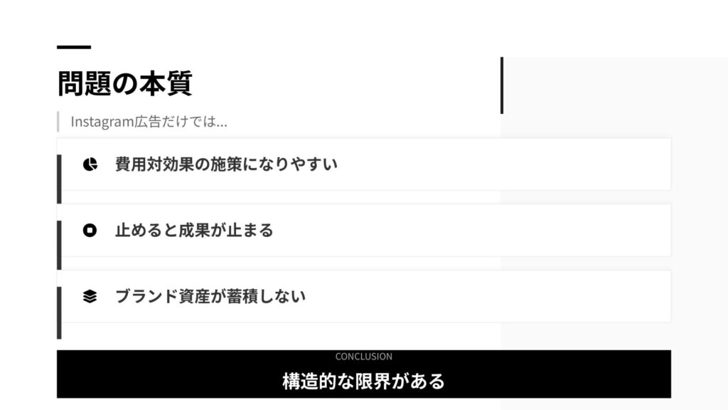 私たちが最も危惧しているのは、Instagram広告だけに依存した施策が、どうしても「フロー型(垂れ流し型)」になってしまう点です。