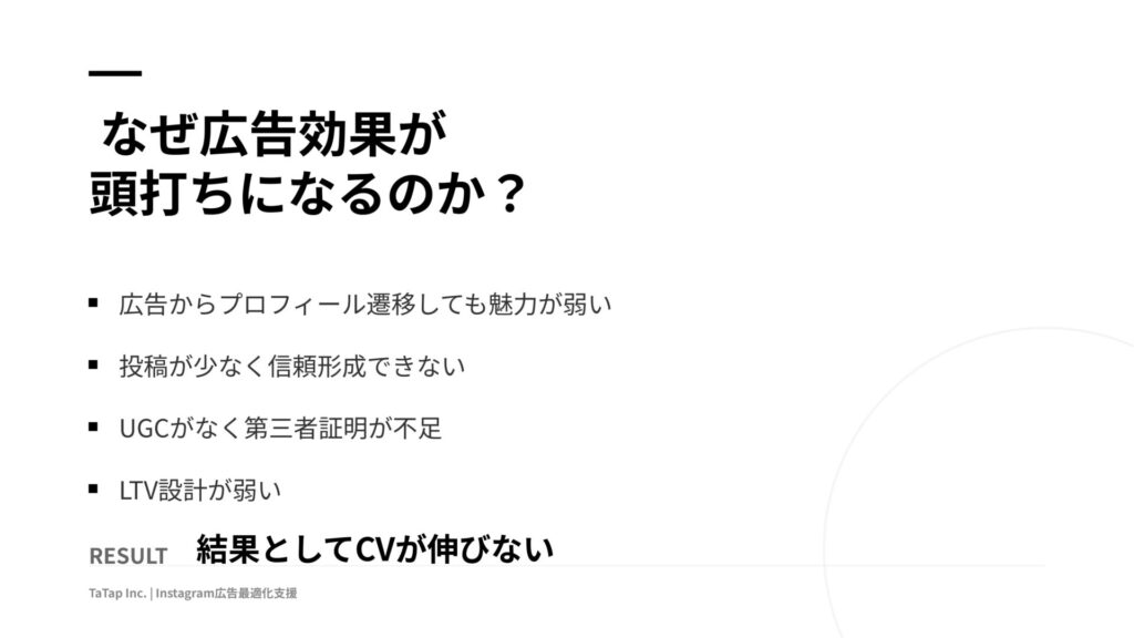 広告効果が伸び悩む最大の理由は、「アカウント運用やUGCが整っていない状態で、無理やり広告だけを回している点」にあります。