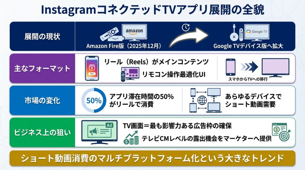| 展開の現状 | 2025年12月のAmazon Fire版に続き、米国でGoogle TVデバイス向けにInstagramのCTVアプリが展開開始された。 |