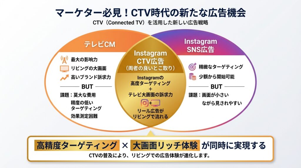 InstagramのCTVアプリ展開は、企業のマーケティング担当者にとって「全く新しい広告チャネルの誕生」を意味します。