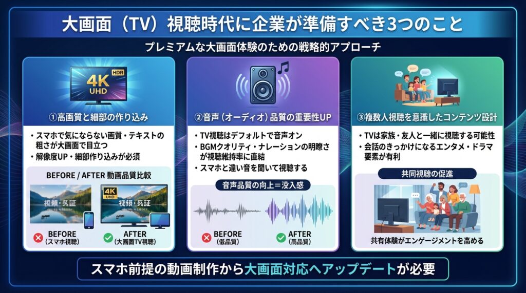 CTVでの視聴が増えるということは、これまでの「スマホの小さな画面でだけ見られること」を前提とした動画作りを見直す必要があります。