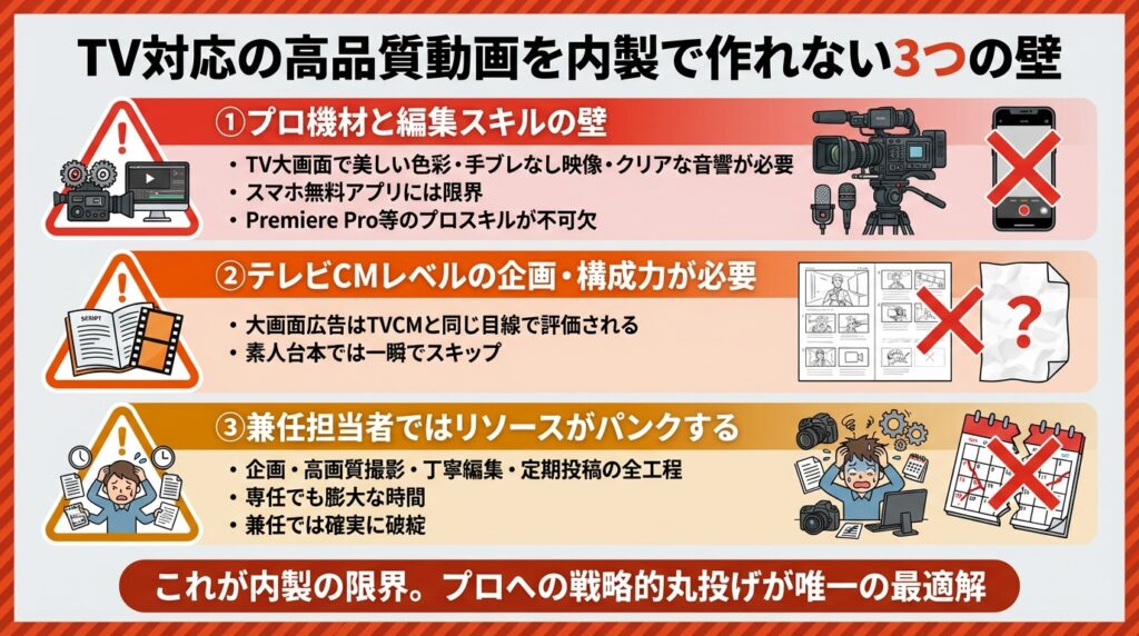 限界のリアル:なぜ自社運用(内製)で「TV対応の高品質動画」を作るのは難しいのか?
