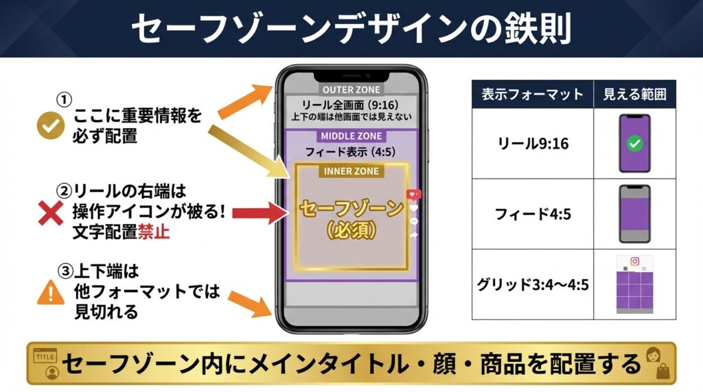- 今後の投稿は「フィード」「リール」「グリッド」すべての比率で重要情報が中央に収まる「セーフゾーン」を意識してデザインする。