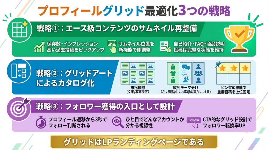 つまり、サムネイルを正しく編集・配置することは、単なるデザインの好みの問題ではなく、「プロフィール訪問率」を「フォロワー転換率」へと引き上げるための最も重要なコンバージョン施策(CRO)なのです。