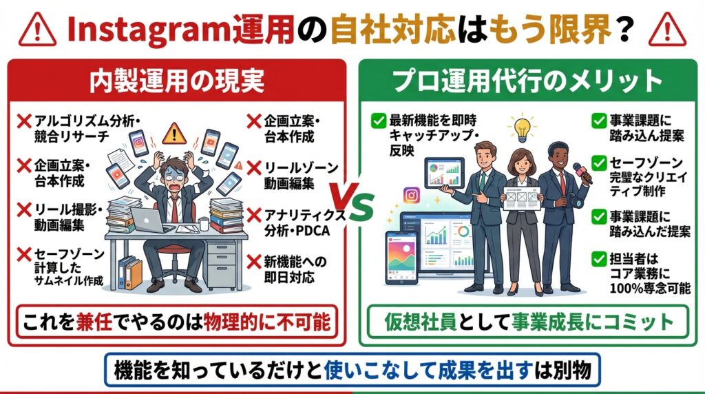 2026年現在、Instagram運用は「空いた時間に写真を1枚アップする」ような手軽なものではなくなりました。 アルゴリズムを分析し、競合をリサーチし、企画を立て、台本を作り、リール動画を撮影・編集し、さらにセーフゾーンを計算したサムネイルを複数パターン作成し、投稿後はアナリティクスを見てPDCAを回す…。 これらはもはや、片手間でできる業務量ではありません。専任のチームが必要です。