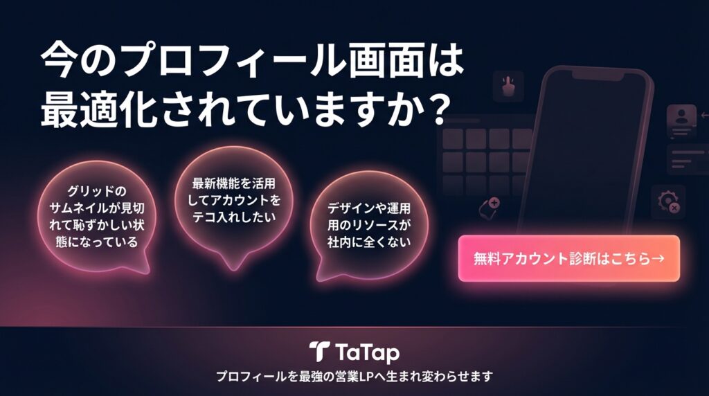 Instagramは、正しく運用すれば必ず事業の柱となる強力なチャネルです。 「今のプロフィール画面が最適化されているか自信がない」「最新の機能を使ってアカウントをテコ入れしたい」とお考えの方は、ぜひ一度、弊社の無料アカウント診断をご利用ください。貴社に合わせた具体的な改善案を提案させていただきます。