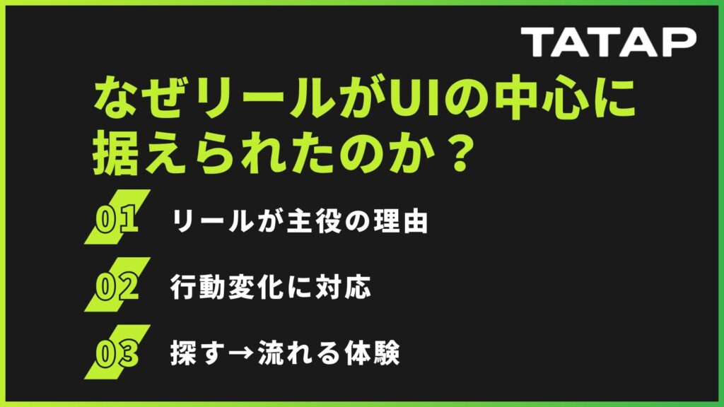人々は、静止画のように「情報を探す」能動的な行動よりも、リールのように次々と興味のあるコンテンツが流れてくる「フロー体験」を好むようになりました。