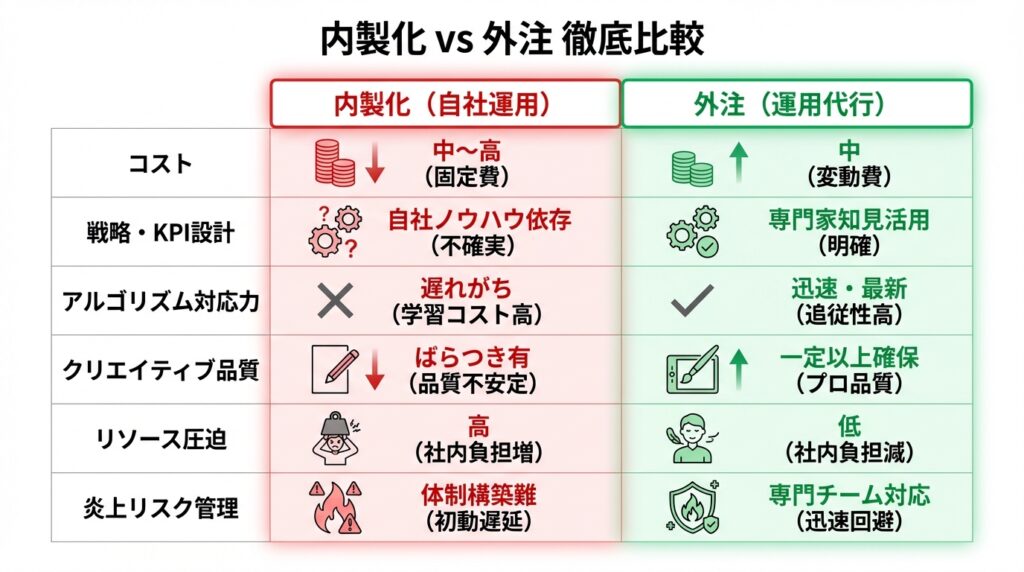しかし、アルゴリズムが複雑化し、競合他社がプロを雇って本気でマーケティングを展開する2026年現在において、リソースもノウハウも不足している状態での「内製化への執着」は、ビジネスの成長を止める最大の要因となります。