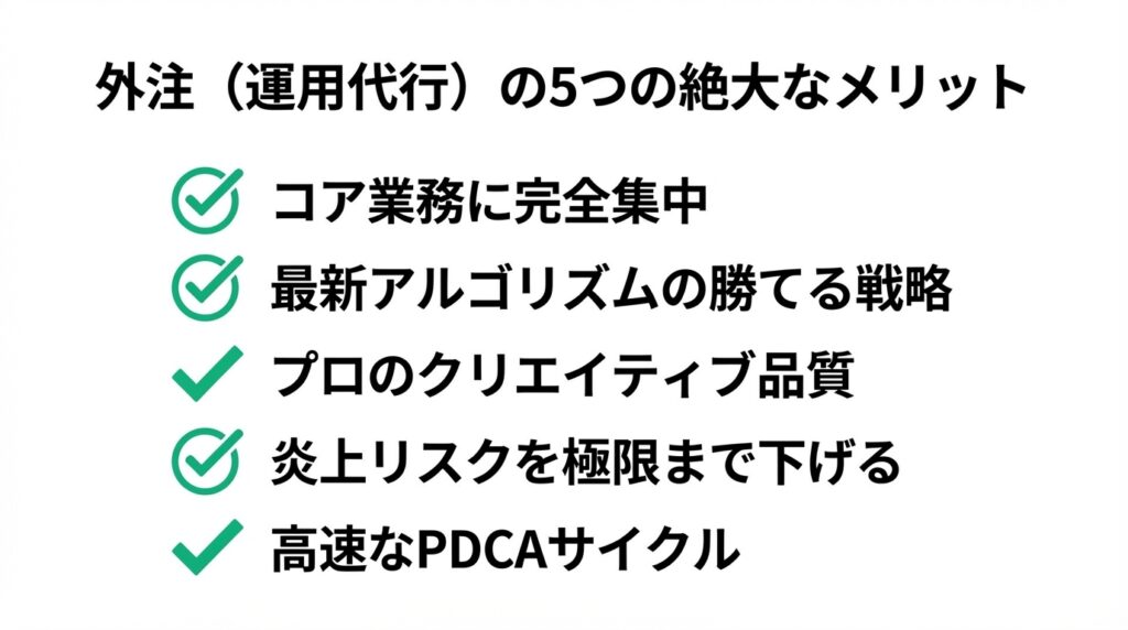内製化の限界を突破し、SNSを「確実に売上を生み出す強力な営業マン」に変えるためには、運用代行会社への外注が不可欠です。外注に切り替えることで、企業は以下の5つの絶大なメリットを享受できます。
