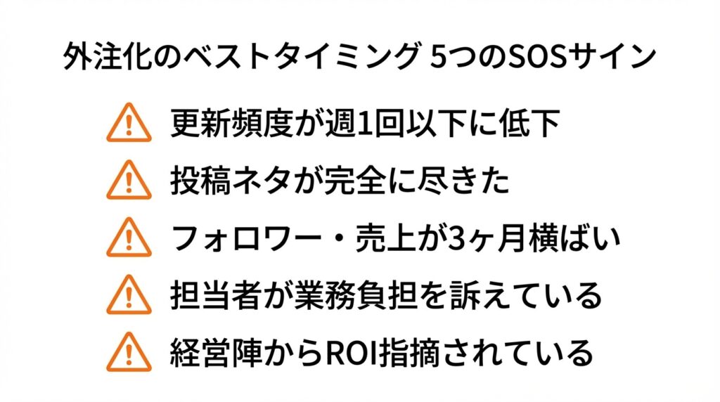 「いつ外注に切り替えるべきか?」と迷っている場合、自社のアカウントや担当者に以下の「SOSのサイン」が出ていないか確認してください。一つでも当てはまれば、即座に外注を検討すべきタイミングです。
