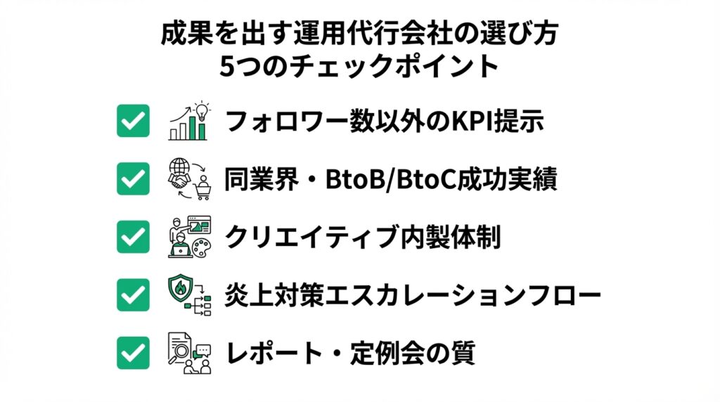 SNS運用代行のニーズが高まるにつれ、「ただ言われた通りに投稿するだけ」の質の低い業者も増えています。確実な成果を出してくれる優秀なビジネスパートナーを見極めるための、5つのチェックポイントを紹介します。
