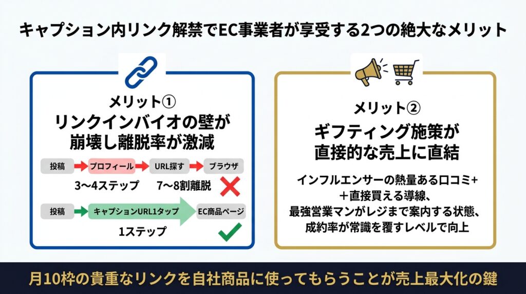 この「クリエイターによるキャプション内リンク」のテスト開始は、自社でECサイトを運営する事業者にとって、とてつもないビッグチャンスをもたらします。具体的にどのようなメリットがあるのか、深掘りして解説します。