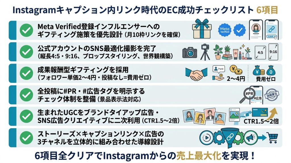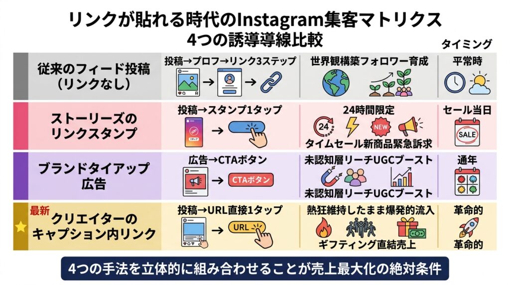 このように、Instagramには複数の誘導手段が存在します。最新の「キャプション内リンク」だけを追うのではなく、ブランドの受け皿となる公式アカウントの構築、リアルタイムなストーリーズ、そして広告配信を「立体的に組み合わせること」が、売上最大化の絶対条件となります。