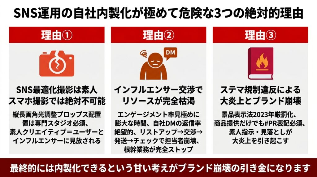 現代の高度化・複雑化したSNS運用を自社で行う(内製化する)ことは、企業にとって百害あって一利なしの極めて危険な行為です。「最終的には自社でできるようになる」という甘い考えは、ブランドを崩壊させる引き金にしかなりません。