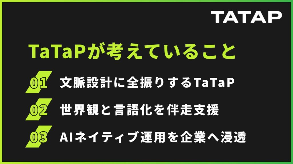 - TaTaPは文脈設計とAIネイティブ運用を伴走支援