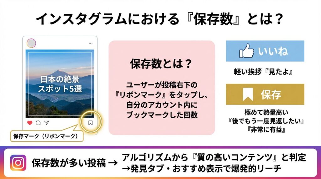 インスタグラムの「保存数」とは、ユーザーが投稿の右下にある「リボンマーク(しおりマーク)」をタップし、自分のアカウント内にその投稿をブックマークした回数のことです。