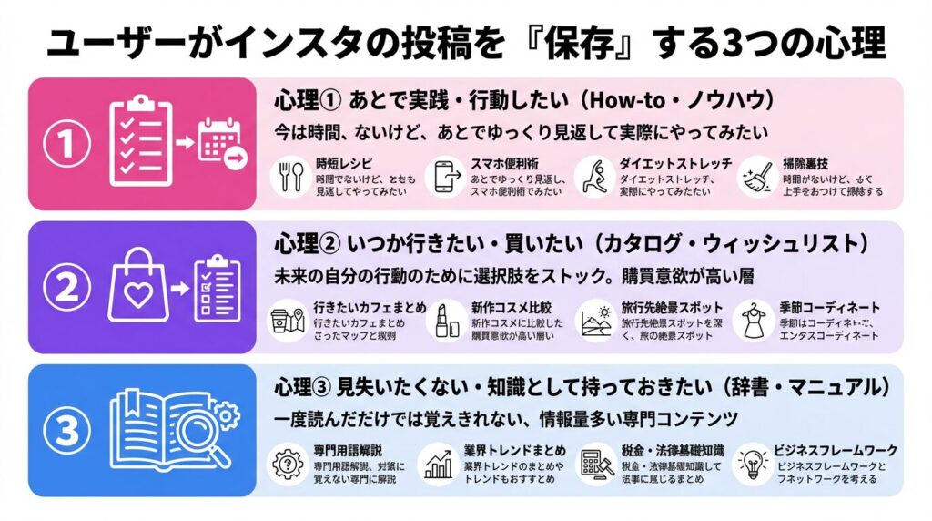 保存数を増やす投稿を設計するには、まず「人はどんな時に投稿を保存するのか」という心理状態を理解する必要があります。ユーザーが保存ボタンを押す動機は、大きく分けて以下の3つしかありません。