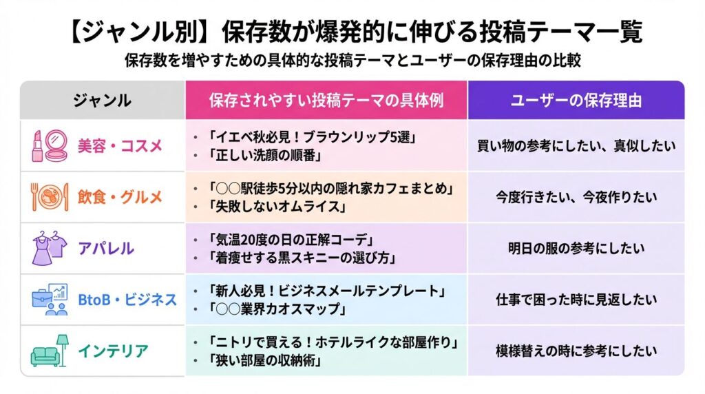 | ジャンル | 保存されやすい投稿テーマの具体例 | ユーザーの保存理由 |
