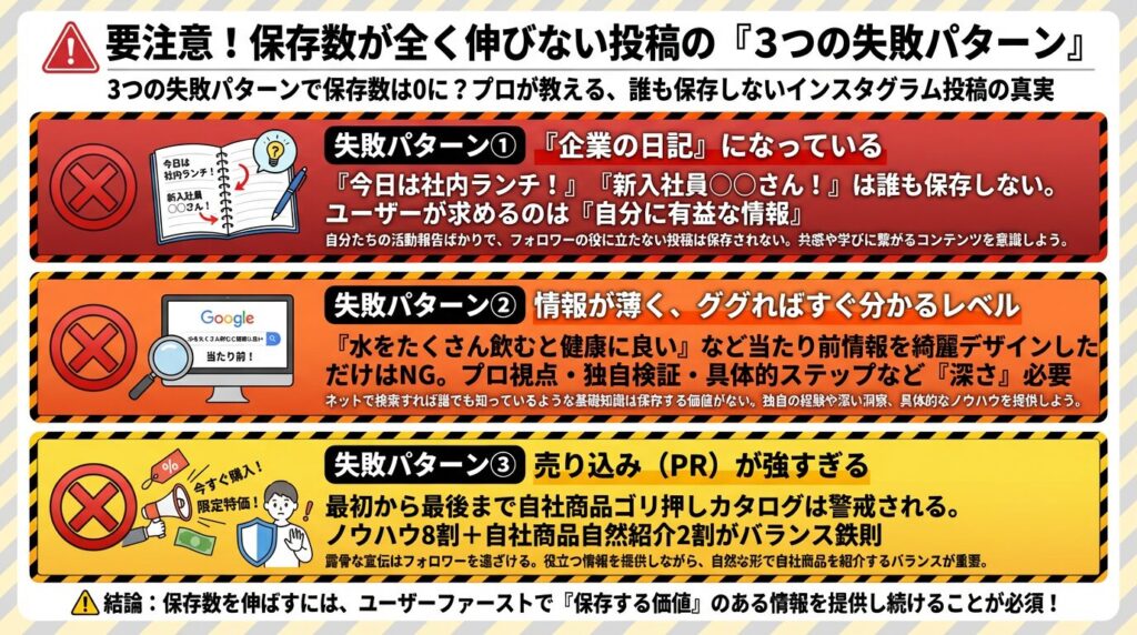 一生懸命投稿を作っているのに保存数が伸びない場合、以下の失敗パターンに陥っている可能性が高いです。