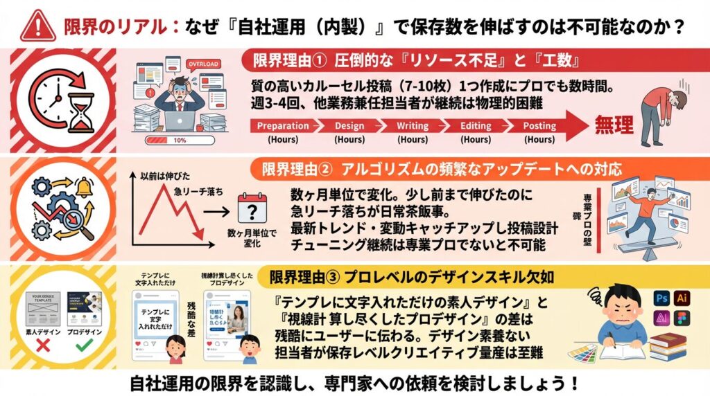 ここまで、保存数を増やすための高度な戦略やデザインの手法を解説してきました。しかし、企業のSNS担当者様が直面する最も残酷な現実は、「これを自社の限られたリソース(内製)でやり切るのは、ほぼ不可能に近い」ということです。