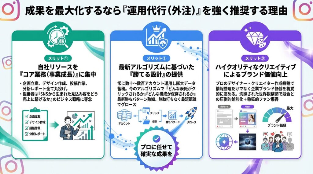 上記のようなリソース不足、専門知識の欠如、アルゴリズム変化への対応遅れを防ぎ、インスタグラムを「確実に売上と認知を生み出す資産」にするためには、SNSマーケティング専門の「運用代行会社(代理店)」へ依頼することが最も賢明で確実な選択です。