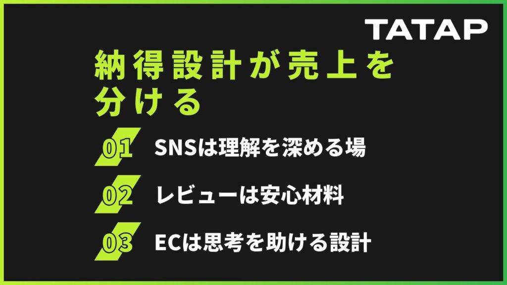 SNSで興味を持つ → ECで比較検討する → レビューで腹落ちする