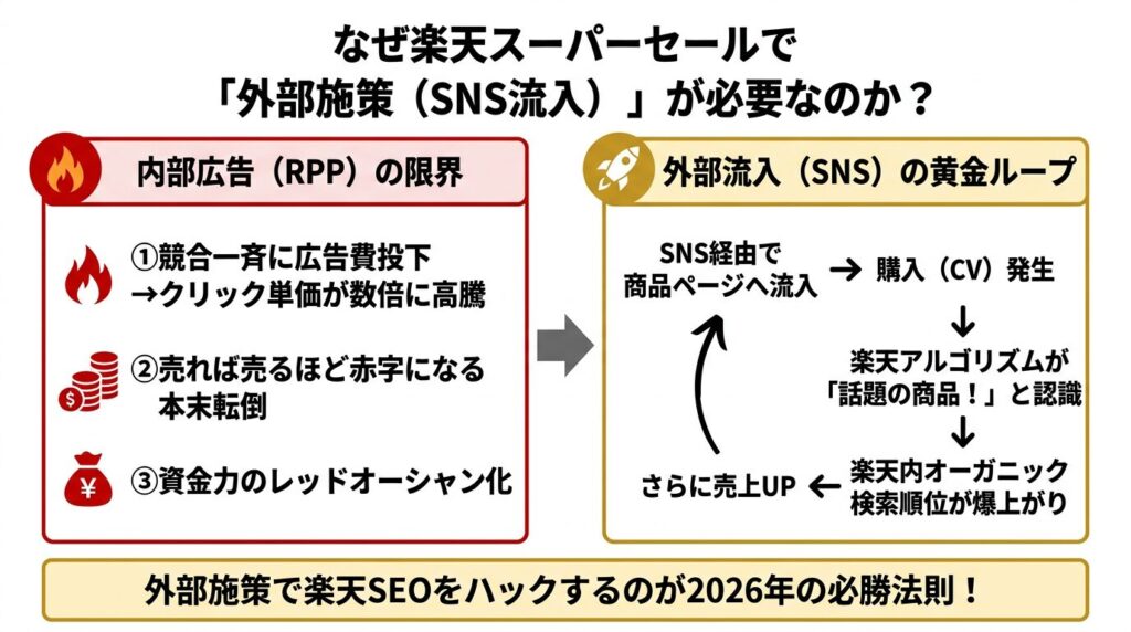 【2026年最新】楽天スーパーセールの売上を爆増させる外部施策(SNS流入)。内部広告に頼らずランキング1位を獲るプロの戦略