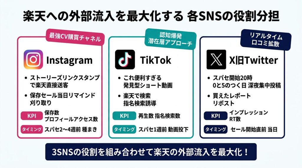 お急ぎの方向けに、楽天スーパーセールにおける外部施策(SNS流入)の重要ポイントをまとめます。