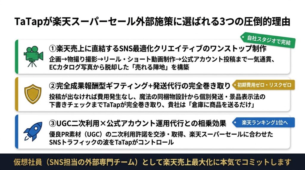 本記事では、SNSマーケティングのプロフェッショナルである我々TaTapが、楽天スーパーセールにおける外部施策の絶対的な優位性から、実際の成功事例(RAKUFIT様、STARFOCUS様)、そして自社運用(内製化)が確実に失敗する理由、バズを確実な売上に変える「SNS最適化クリエイティブ」の秘密までを徹底解説します。