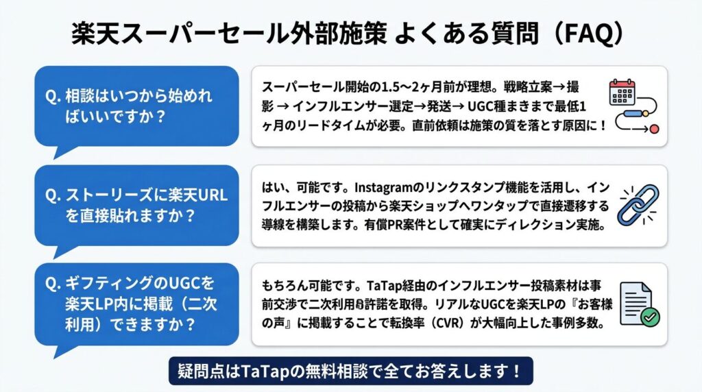 A. もちろんです。TaTapを通じて依頼したインフルエンサーの投稿素材(UGC)は、事前の交渉において「二次利用の許諾」を取り付けることが可能です。質の高いリアルなUGCを楽天のLP内に「お客様の声」として掲載することで、楽天内での転換率(CVR)が大幅に向上した事例が多数ございます。