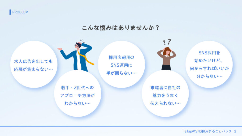 この記事では、『TaTapのSNS採用丸ごとパック』がどのように採用課題を解決するのか、その具体的な特徴や他社との違いについて解説していきます。