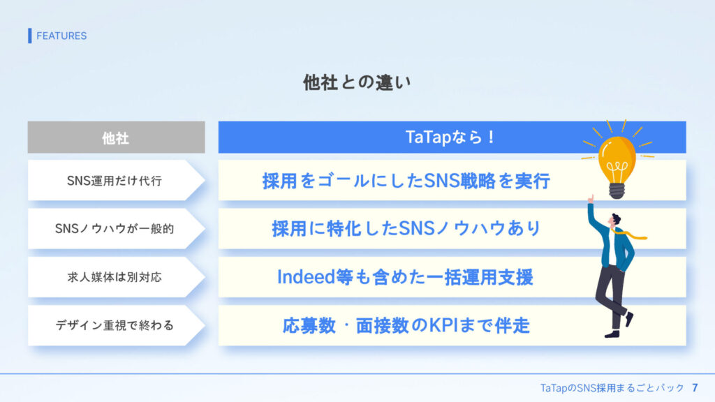 SNS運用代行サービスや採用コンサルティングを提供する企業は数多くありますが、『TaTapのSNS採用丸ごとパック』には、他社にはない明確な強みがあります。