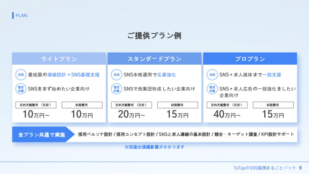 全プラン共通で実施する内容: 採用ペルソナ設計、採用コンセプト設計、SNSと求人導線の基本設計、KPI設計など、戦略の根幹となる設計部分は全プランで実施します。