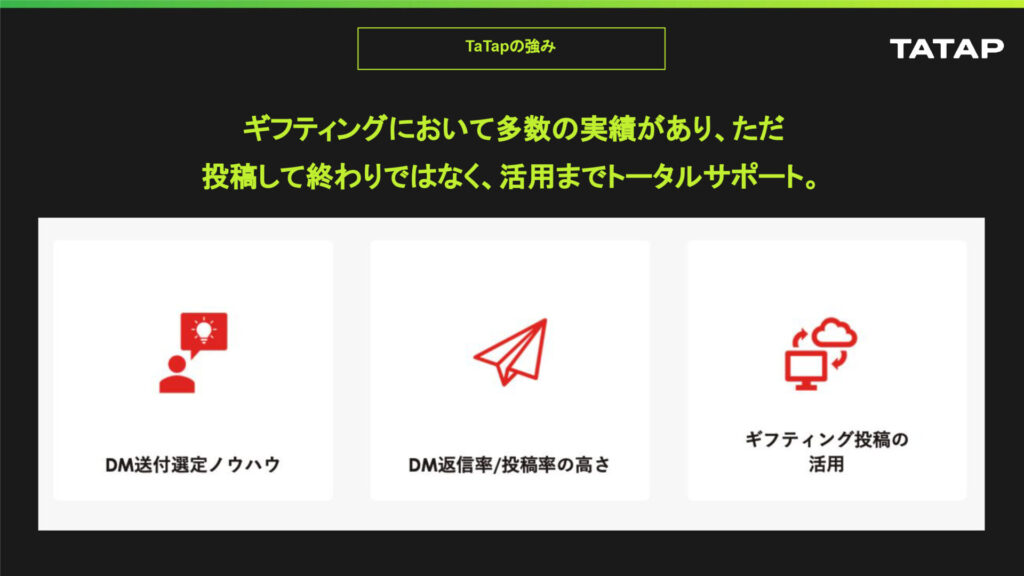 弊社TaTapでは毎月数千件のギフティングDMを送付し、投稿して終わりではなく活用までトータルサポートしています。