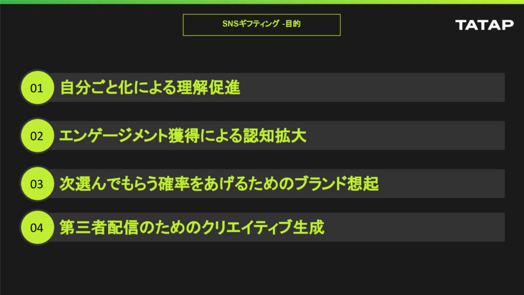 短期的にも中長期的にも有効な施策として、SNSギフティングは今後のマーケティング戦略に欠かせない手法です。