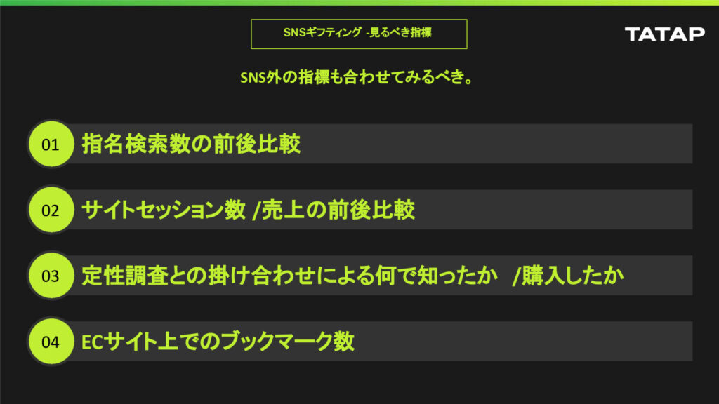 もちろん、X(旧Twitter)などでは稀にラッキーパンチ的に売上が上がることもあります。しかし、ギフティングの本来の目的はあくまで認知拡大やブランド理解の促進です。売上増加を目的とする場合は、広告や販売施策と組み合わせる必要があります。