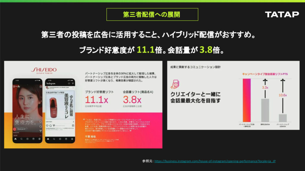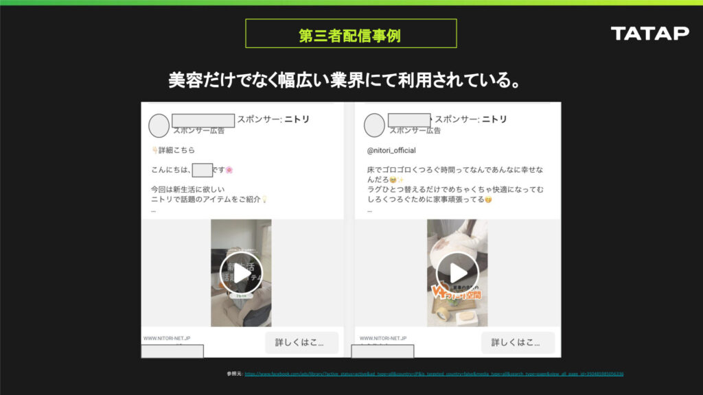 SNSギフティングによる成功事例としては、美容業界の資生堂さんや、インテリア業界のニトリさんがあります。投稿を第三者配信に活用することで、ブランド好意度11.1倍、SNS上での会話量3.8倍の成果が確認されています。