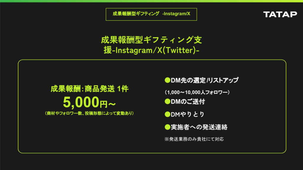 弊社TaTapでは、成果報酬型でSNSギフティング支援を行っています。