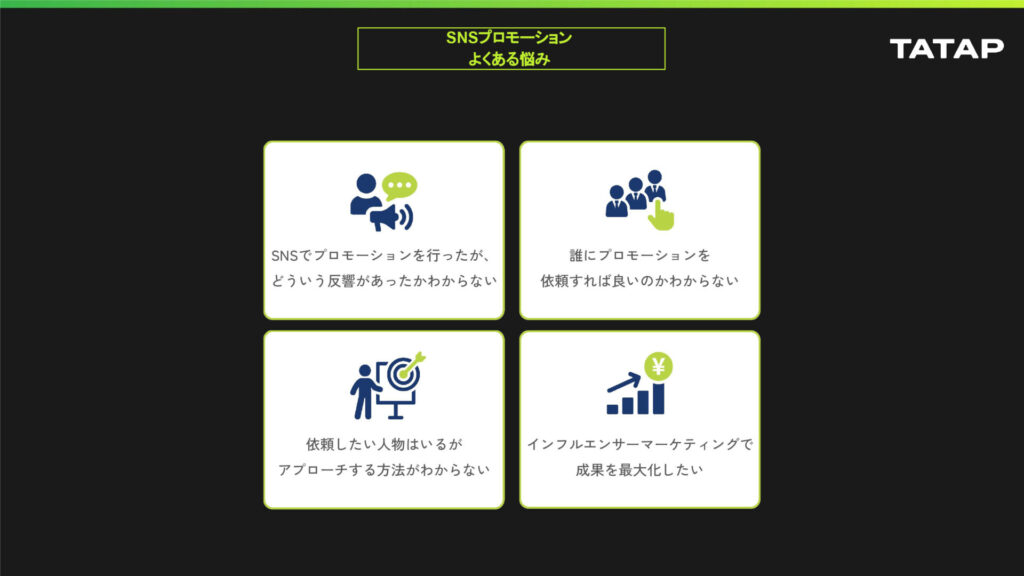 - 成果を最大化する方法が分からない インフルエンサーマーケティングを活用したいが、具体的な進め方が分からない。