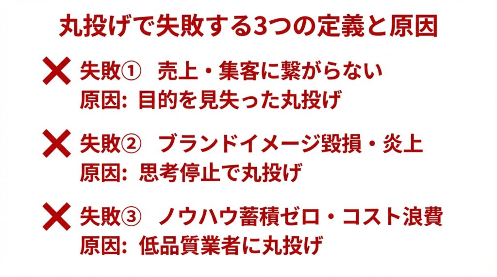 - 失敗は丸投げ自体でなく業者選定と丸投げ方法