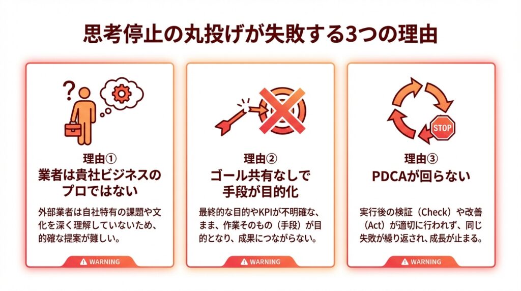 SNS運用代行の失敗は、「外注すること」が悪いのではありません。自社のビジネスや目的を理解しようとしない「作業だけの悪徳業者(またはスキル不足のフリーランス)」に対して、自社も思考を停止して「とりあえず適当にやっておいて」と丸投げすることが最大の原因なのです。