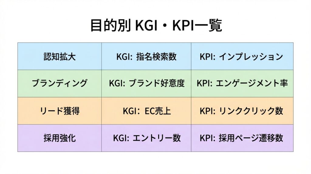 企業がSNSを運用する目的は、大きく分けて「認知拡大」「ブランディング」「リード獲得・売上向上」「採用強化」の4つに分類されます。それぞれの目的ごとに、設定すべきKGIとKPIの代表的な例を表にまとめました。