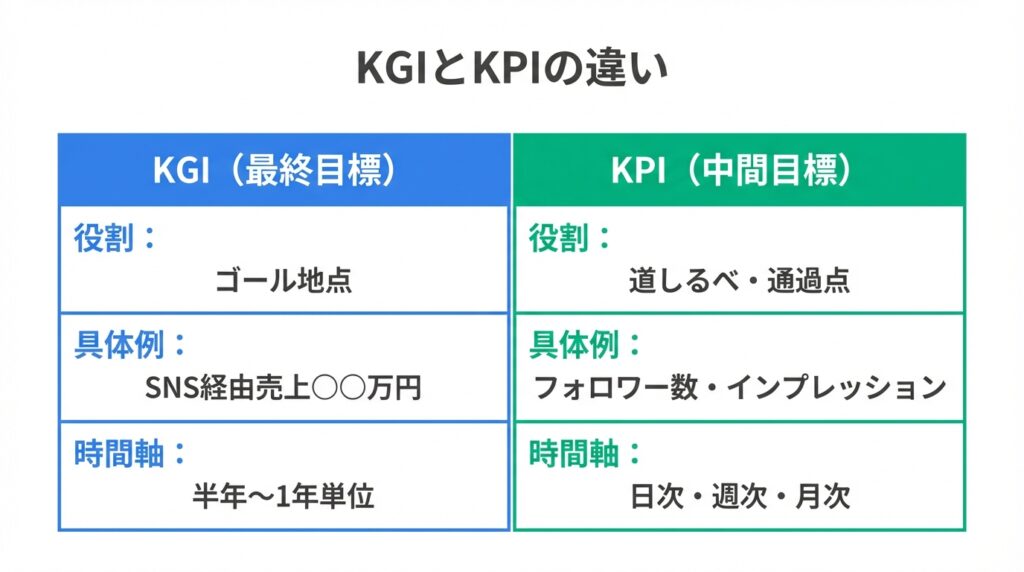 SNS運用においてよくある失敗は、本来「KPI(中間目標)」であるはずの「フォロワー数」を、「KGI(最終目標)」に設定してしまうことです。フォロワーが10万人いても、売上や集客に全く繋がっていなければ、ビジネスとしてのSNSマーケティングは失敗と言わざるを得ません。