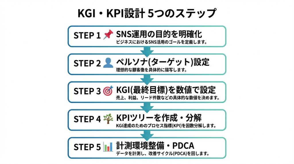 それでは、実際に社内でKGIとKPIを設計するための具体的な手順を5つのステップで解説します。