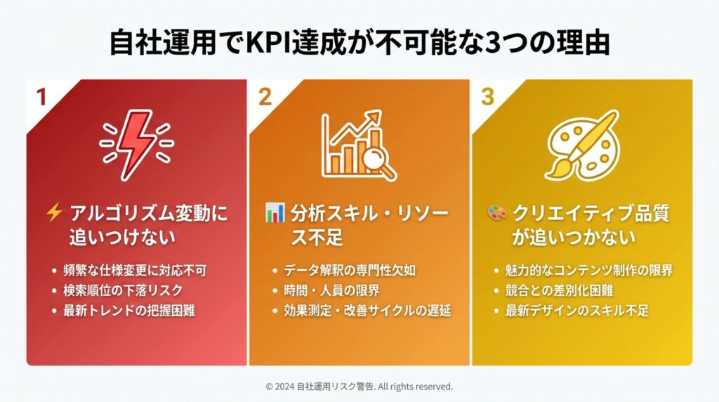 限界のリアル:なぜ「自社運用(内製)」でKPIを達成するのは不可能なのか?
