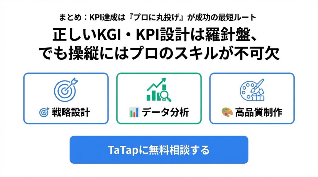TaTapでは、貴社のビジネスモデルを徹底的に分析し、売上やリード獲得という明確な「KGI」から逆算した、戦略的なKPI設計と運用代行をワンストップで提供しております。無駄な施策を徹底的に排除し、最速で成果を創出するプロフェッショナルのノウハウを、ぜひ貴社のビジネスにご活用ください。現状のアカウントの無料診断や、最適な戦略のご提案も行っておりますので、まずはお気軽にご相談ください。