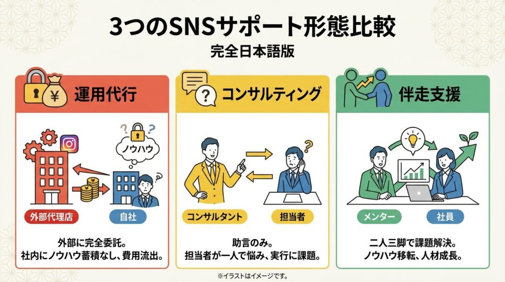 | 適している企業 | 社内リソースがゼロで、とにかく発信を維持したい企業 | すでに優秀な運用チームがあり、上位の戦略だけが欲しい企業 | SNSを重要資産と捉え、本気で成果を出し、最終的に自走したい企業 |