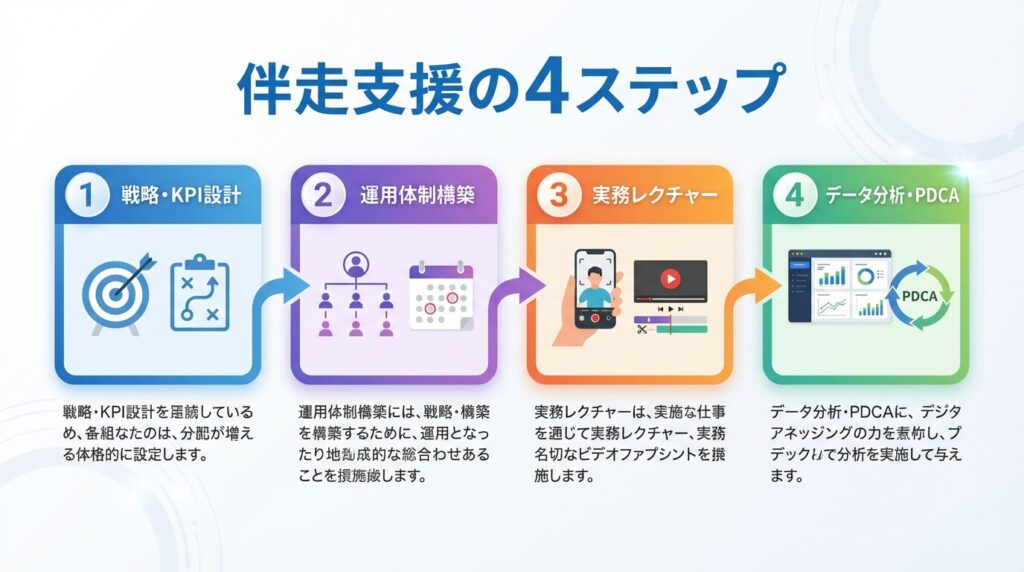 外部業者が定型的な投稿を繰り返す「運用代行」では、このアルゴリズムの変化についていけません。また、理論だけを教わる「コンサルティング」では、動画編集やライティングといった日々の実務の壁にぶつかり、挫折する企業が後を絶ちません。