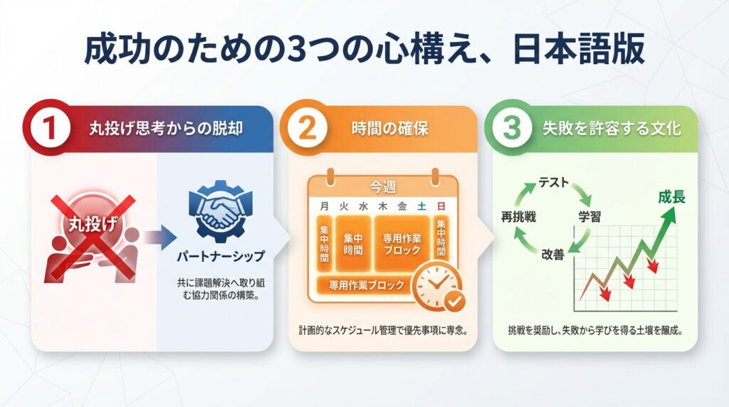 伴走支援は、支援会社が魔法をかけてくれるものではありません。企業側にも「自ら学ぶ」という姿勢が不可欠です。成功する企業が共通して持っている心構えを紹介します。