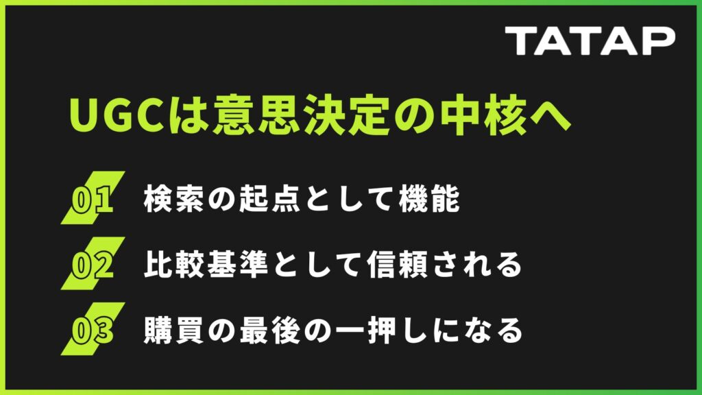 生活者が1.5か所しかチェックしないのであれば、企業はあちこちで薄い露出を狙うのではなく、ターゲットが見る「その場所」で濃いUGCを形成しなければなりません。そのためには、UGCが持つ3つの役割を理解する必要があります。